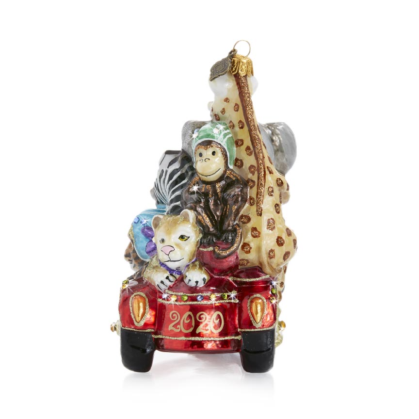 How adorable! Our baby jungle animals have all piled into our glittery jeweled moped to welcome Baby’s First Christmas. Sculpted first in clay and then mouth-blown in glass by old-world glass artisans in Poland. Each animal is delightfully detailed in enamels and glitter and hand-set with Swarovski® crystals.