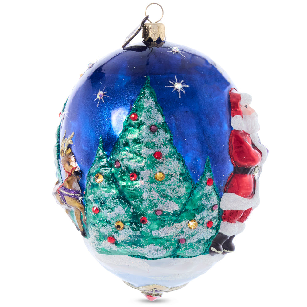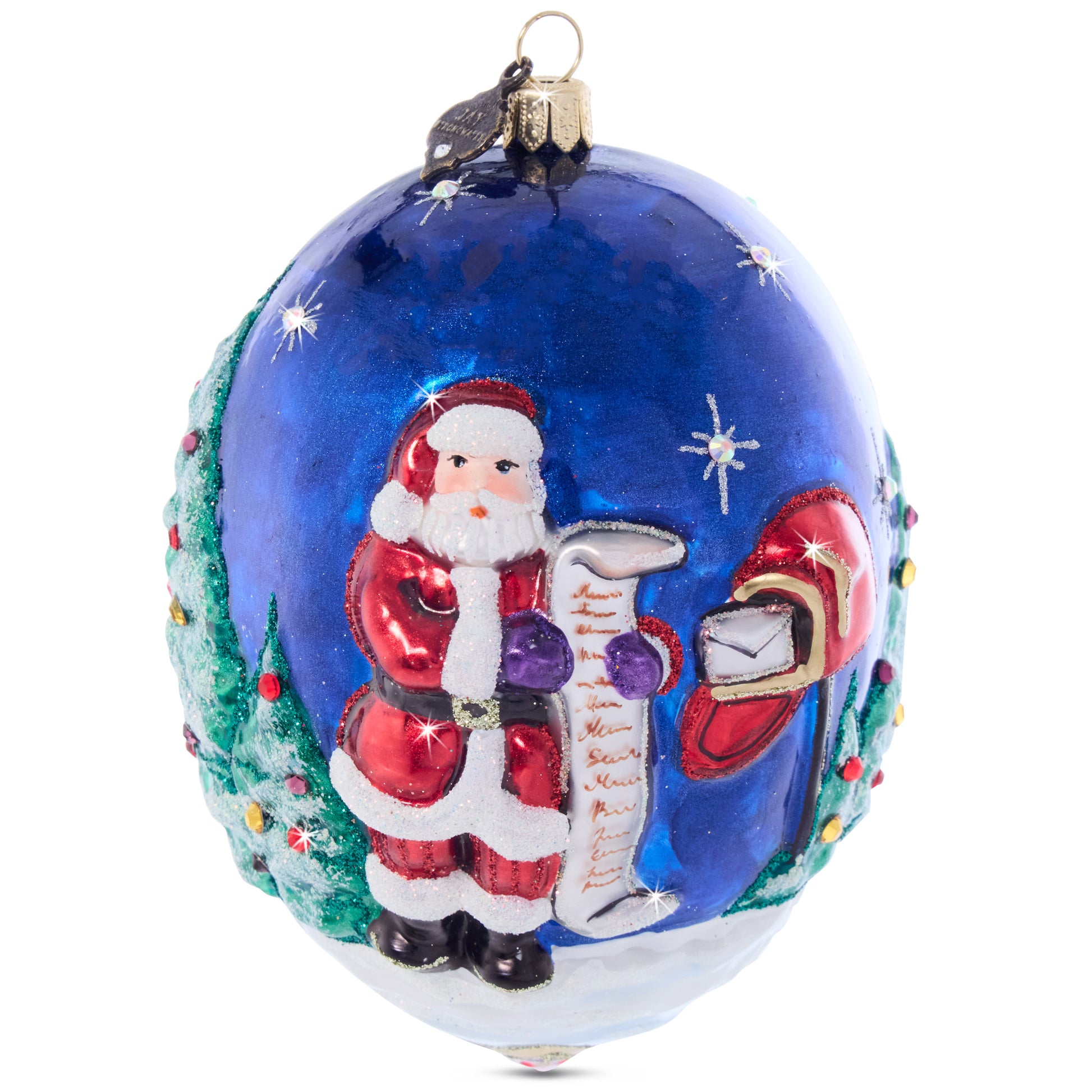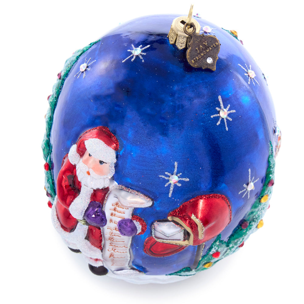 Introducing the enchanting Christmas Delivery Glass Ornament, a delightful creation handcrafted in Poland. With Santa checking his list next to a mailbox and beautifully adorned trees against a deep blue backdrop, this ornament embodies the magic of the season. Each intricate detail and shimmering crystal evoke a sense of heartwarming nostalgia, capturing the essence of festive moments.