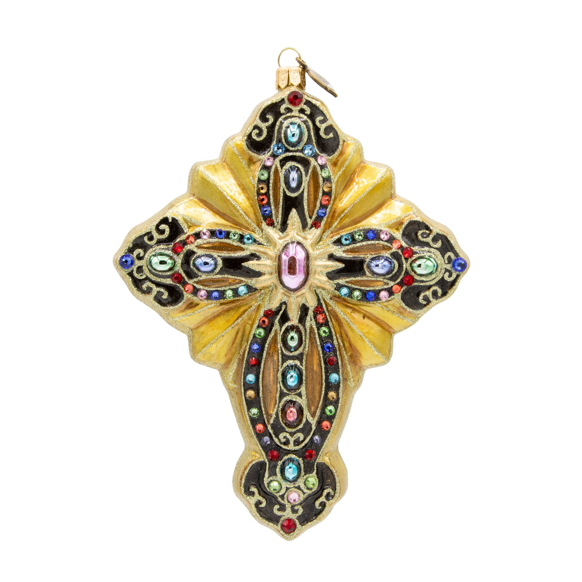 Introducing the 2024 Cross Glass Ornament, a symbol of timeless elegance and grace. Crafted in Poland, this blown glass ornament features a luxurious gold hue, accented by sophisticated black details, and adorned with jewel-toned European crystal embellishments. Embrace the beauty and significance of the cross with this exquisite ornament and elevate your holiday décor with its lavish charm.