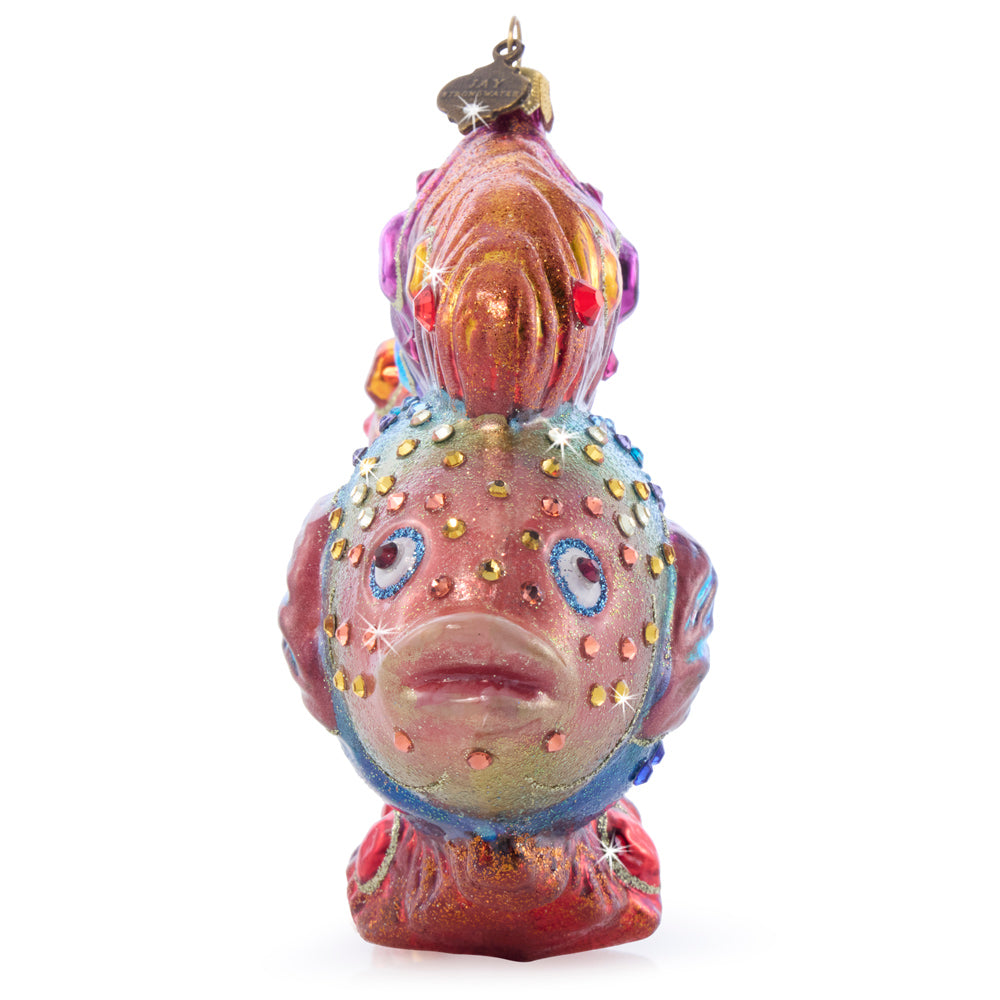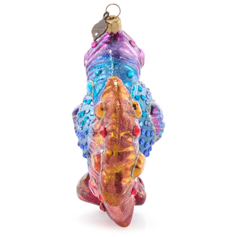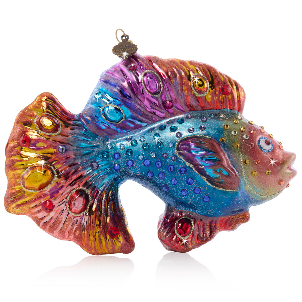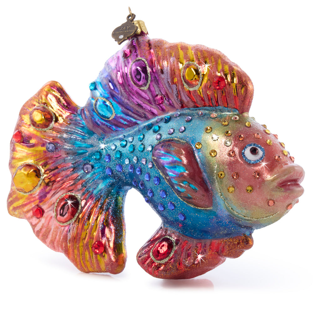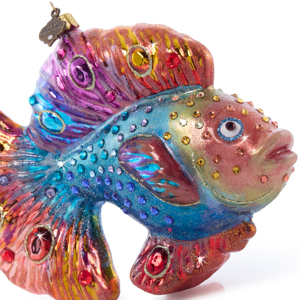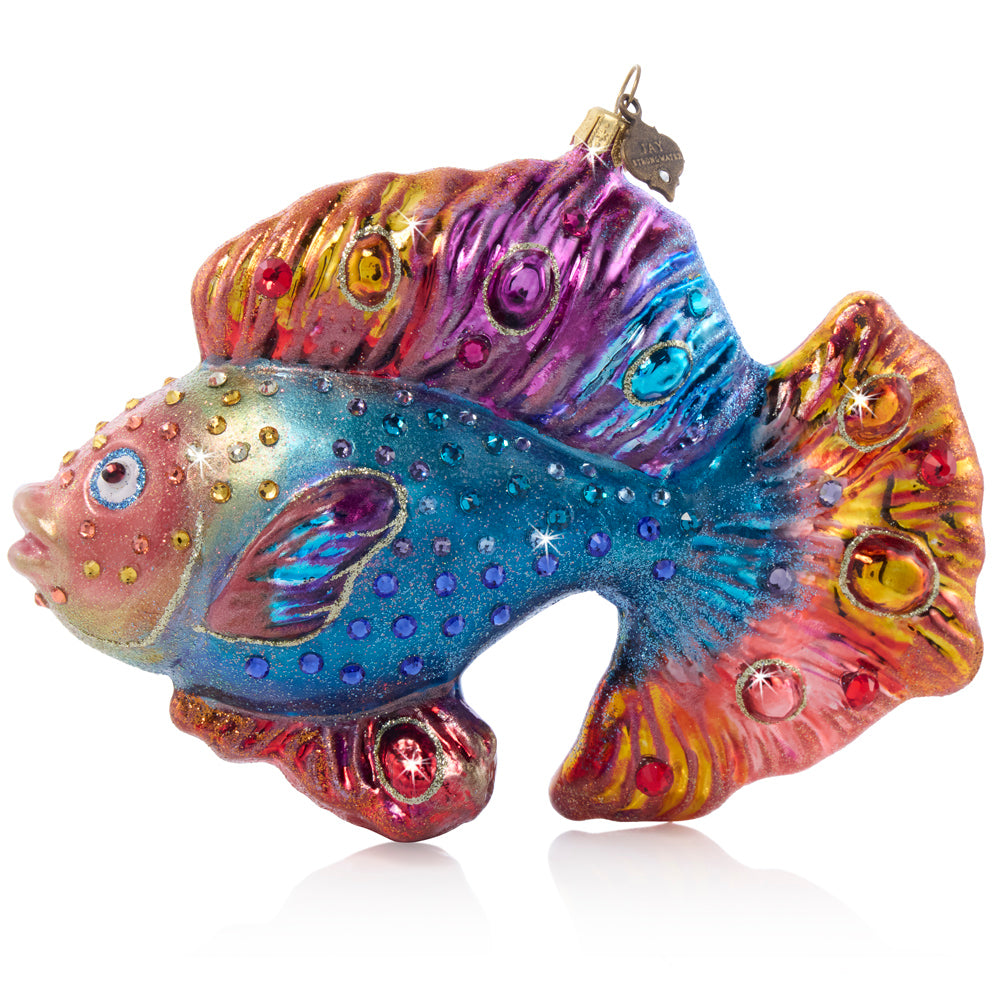 Discover the Fancy Fish Glass Ornament, a dazzling celebration of brilliant rainbow color. Crafted in Poland, this exquisite ornament captures the beauty and vibrancy of the underwater world. Hand-enameled and adorned with prominent sparkling European crystals, it will quickly become a captivating focal point on your tree.