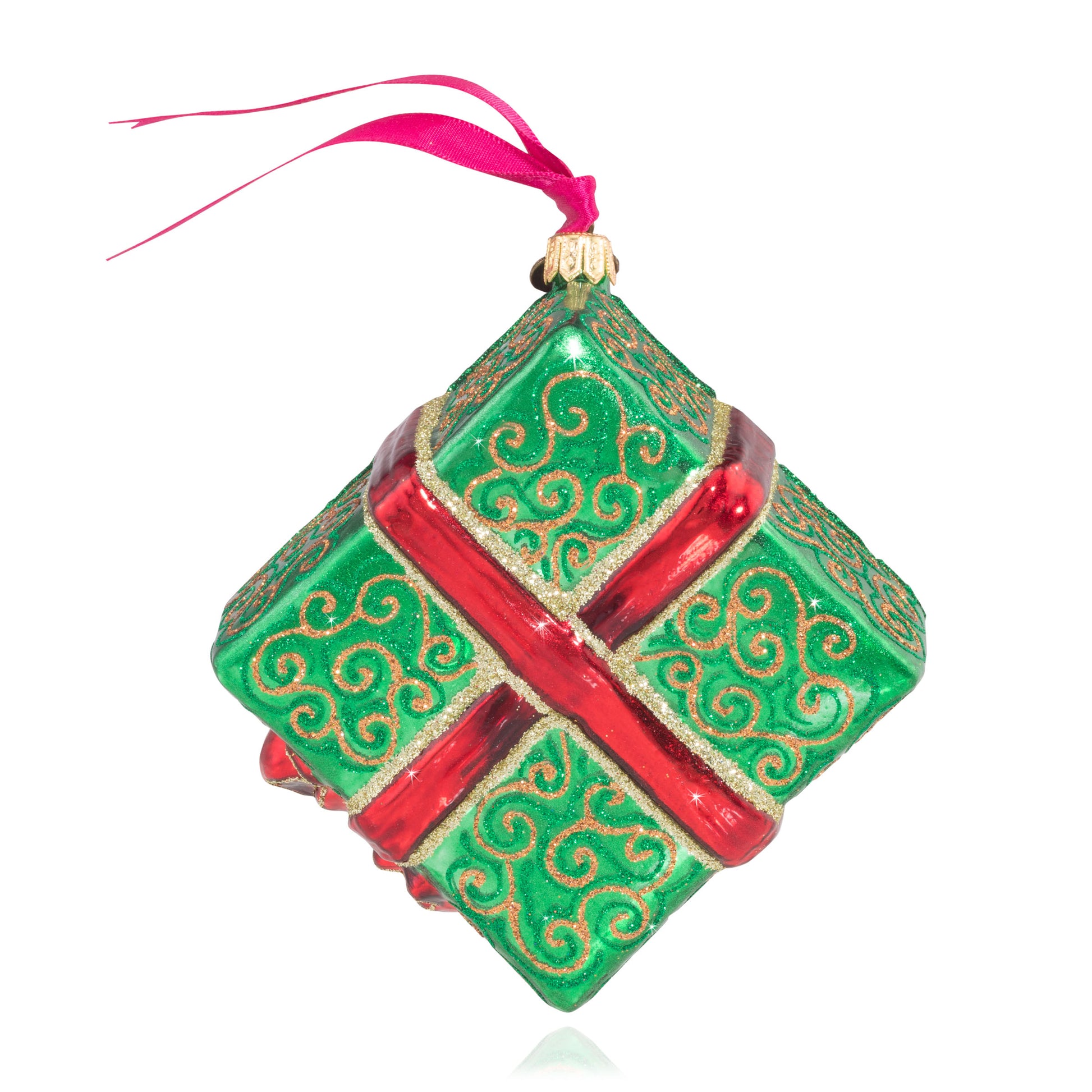 Our “12 Days of Christmas” Holiday ornament series continues with the 2018 introduction of our Five Golden Rings Ornament. These five sparkling bejeweled rings - bursting out of their bowed box - were carved first in clay and then mouth-blown in glass by old-world glass artisans in Poland. Hand-painted in golds with hand-set ruby, emerald, amethyst and sapphire colored crystals on a red bowed emerald colored box. Embellished with fine glitter details and hand-set Swarovski® crystals.