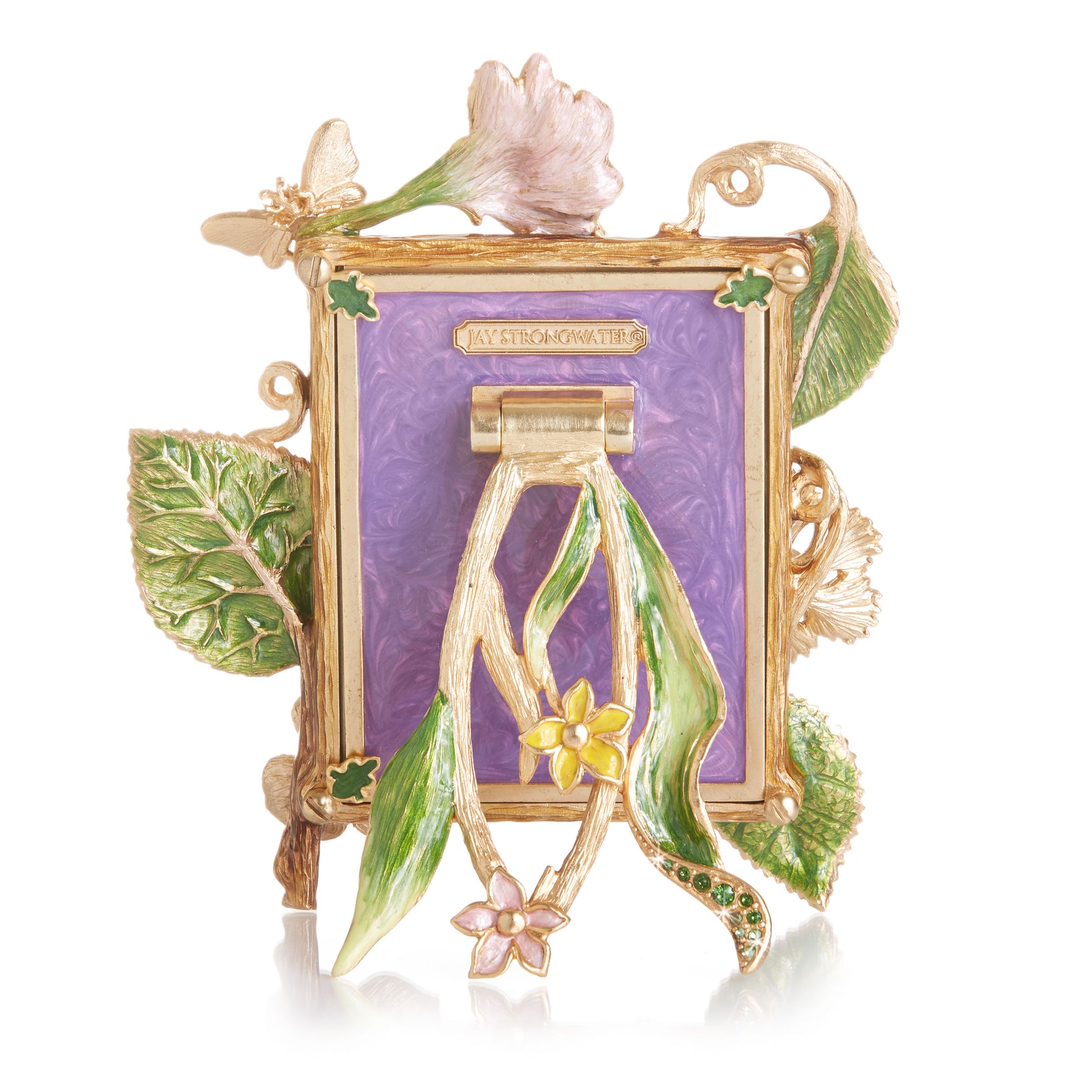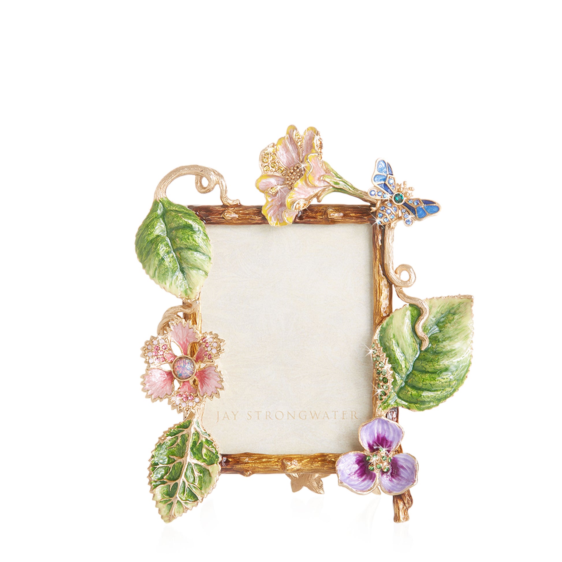 Our artistry shines with this gorgeous fusion of jeweled flowers and luscious leaves wrapped around the Fray Floral 3” x 4” Frame. A mix of hand-painted pansies, carnations and a dragonfly pop against the verdant green leaves.