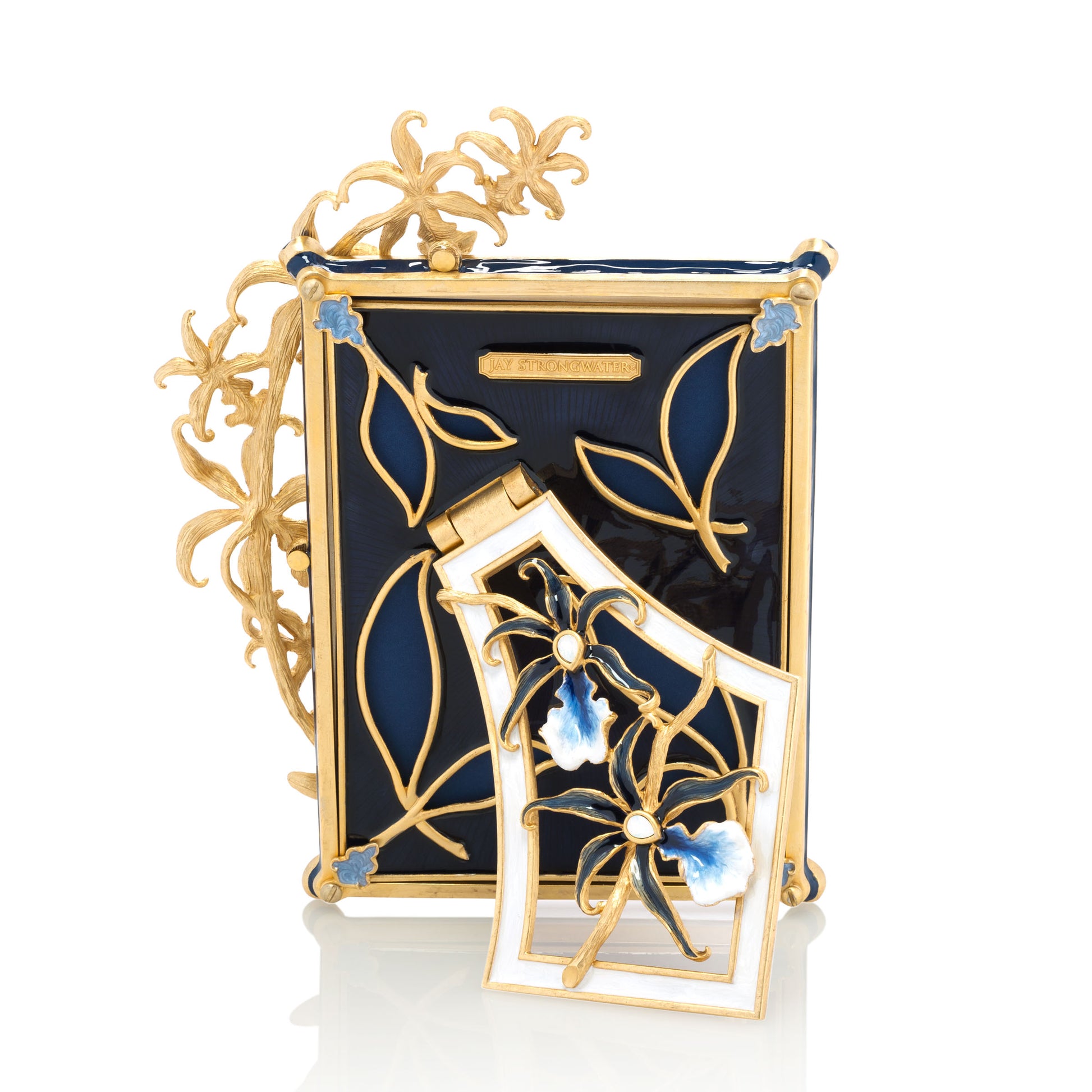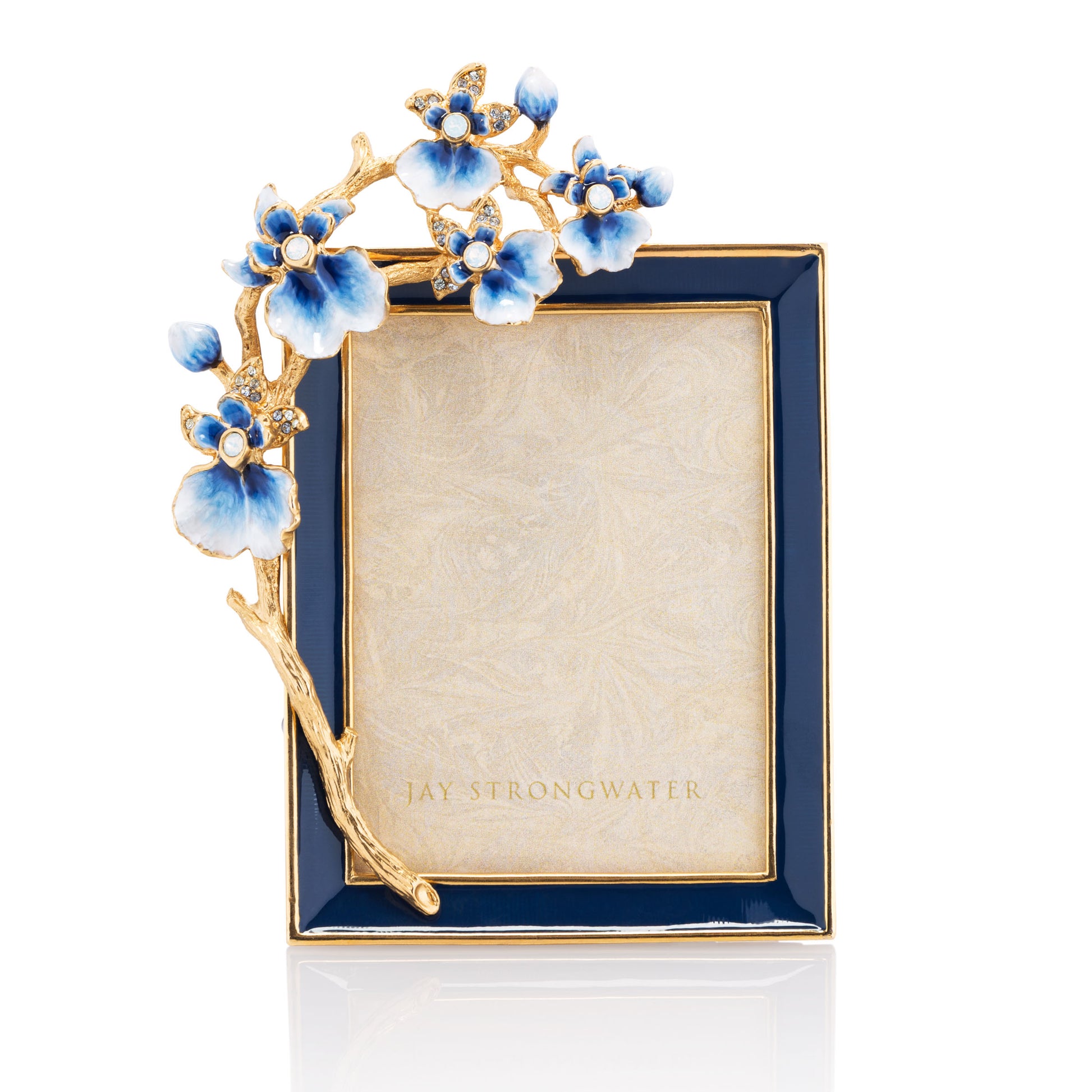 Inspired by painted orchid flowers found on navy and white Chinese porcelains, we have carved a delicate branch of orchids gently swaying over the Kelsey frame. Each petal shaded in hand-painted cream to cobalt enamels with crystal highlights and set against the translucent navy enameled frame. With our signature, enameled metal back plate and kickstand – this frame is truly beautiful from any view. Stands vertically or horizontally.