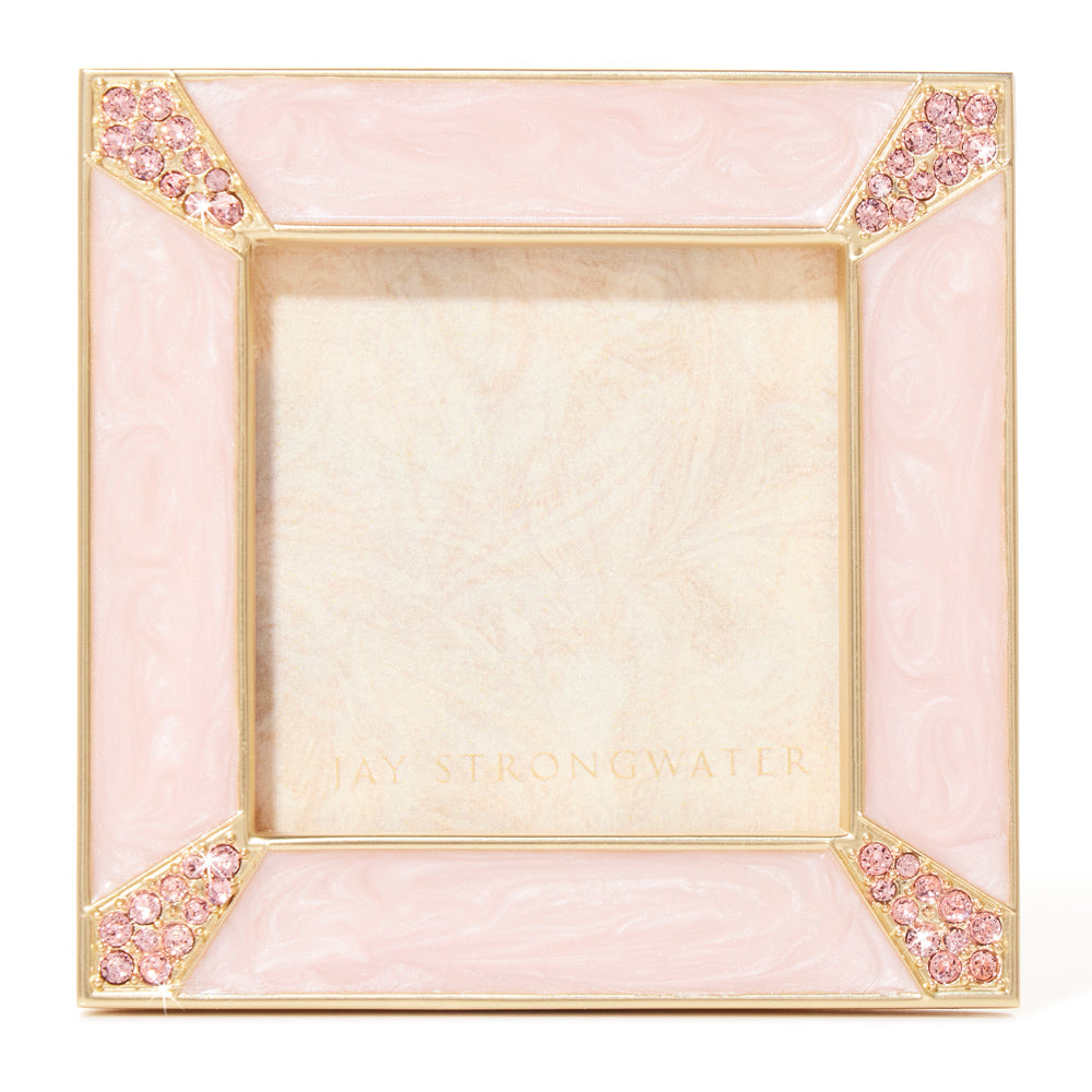 Layers of hand-painted translucent pink enamels decorate this frame with a mesmerizing glow. This Leland Frame is cast in pewter, plated in 14K gold, with pavé corners delicately handset with sparkling European crystals. With our signature, pink enamel back plate – this frame is truly refined from any view.