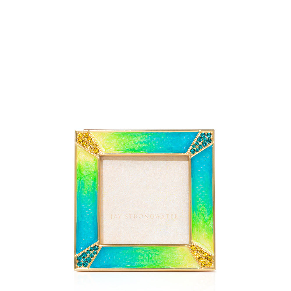 Frame your loved ones with a pop of electric green enamel and jewels! We created a special edition of our classic Leland 2” Pave Corner frame in a vivid ombre of chrome yellow to lime green enamel accented with Swarovski® Topaz and Teal crystals. Hand-painted enamels and hand-set crystals on a 14K gold finished metal frame with our signature enamel back plate – this frame is truly beautiful from any view.