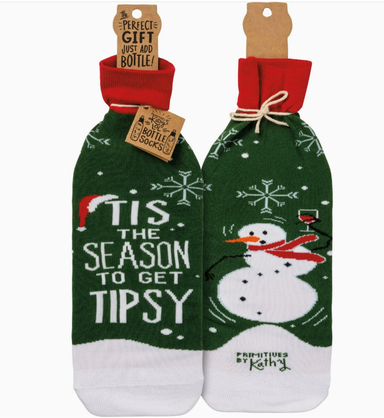 A creative alternative to traditional gift bags, these Wine Bottle Socks add humor, charm, and festive flair to your holiday gifting. Made from a washable and reusable knit blend of cotton, nylon, and spandex.